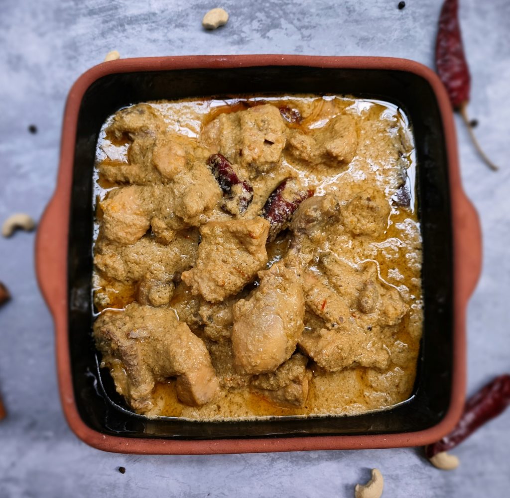 Chicken Rezala is a special dish of West Bengal and is certainly one of its kind with quite standard Nawabi notes. It is slightly on the sweeter side, creamy and full of flavours. The gravy’s creaminess comes from using cashew and poppy seeds paste. The colour of the gravy is white due to the use of white ingredients, mainly yoghurt, cashew, and poppy seeds paste. The spiciness of the curry comes from white pepper powder and green chillies. No turmeric and red chilli powder is used in this curry. When the dish is cooked,a thin layer of fat is separated from the gravy, indicating its authenticity and rich taste.