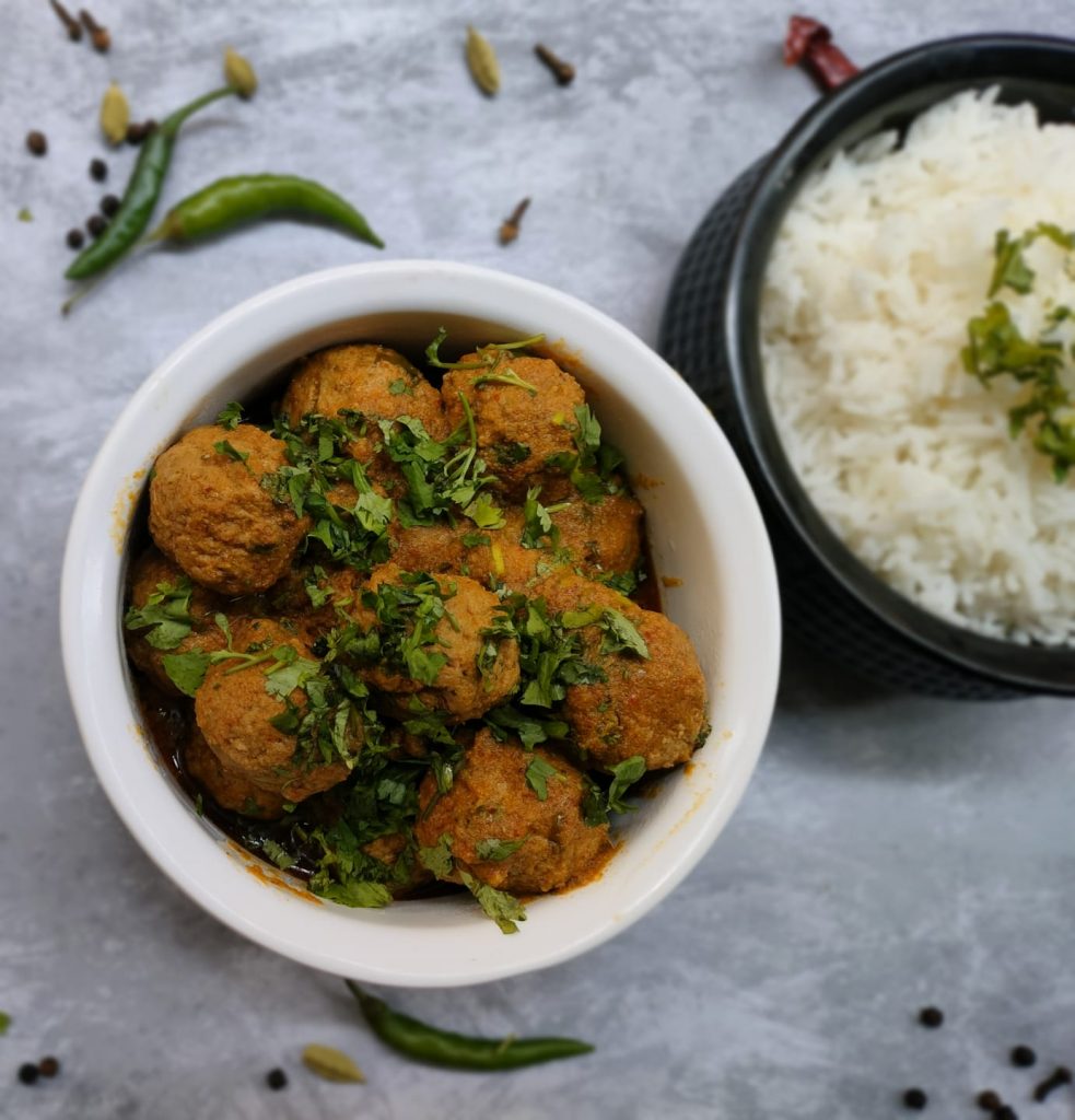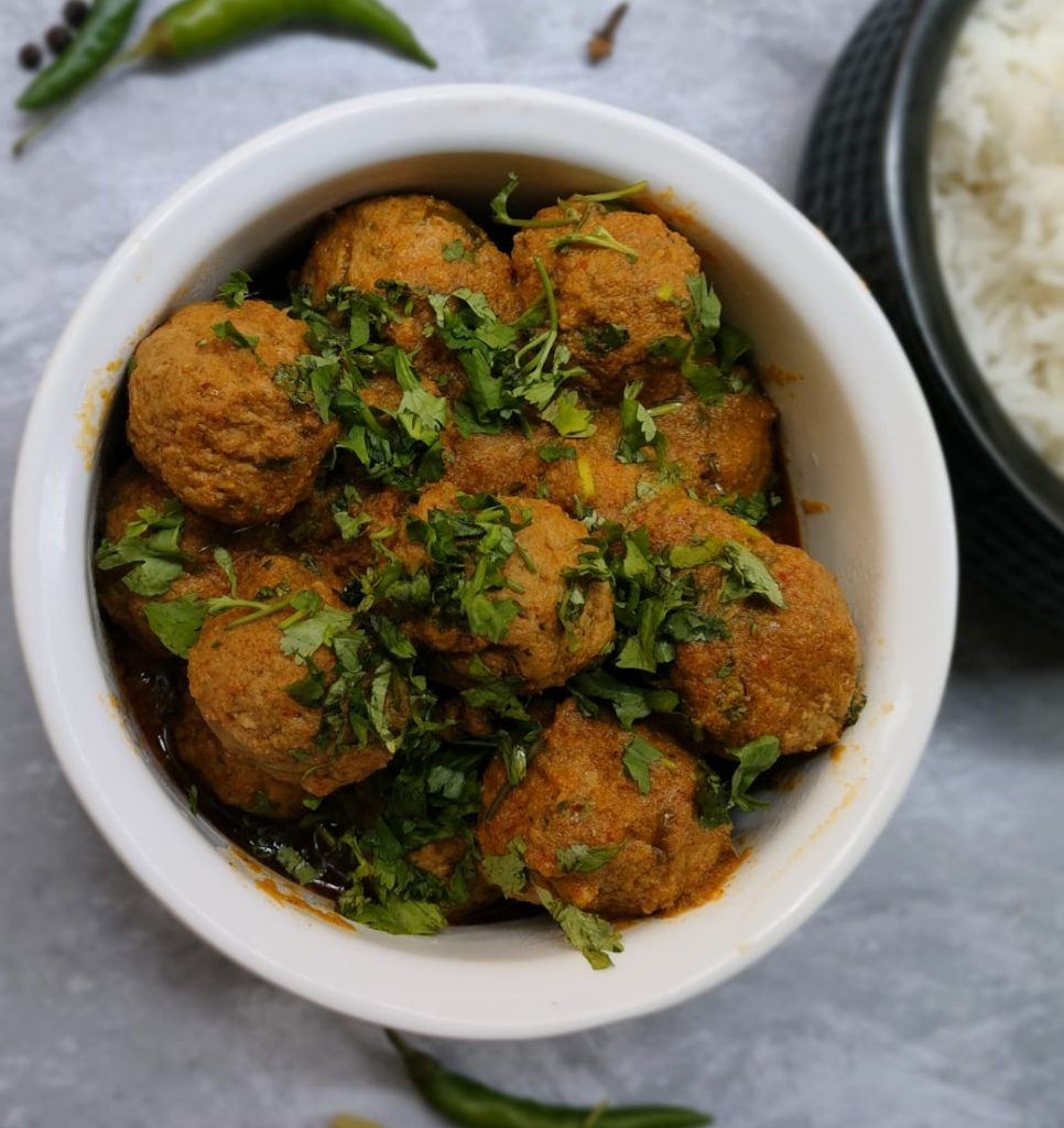 Mutton Kofta Curry is made in stages. First, the kofta is prepared by mixing the spices and then shaped into small balls. This kofta’s unique aspect is that it is not fried before putting it into the gravy. They directly cook into the simmering hot gravy, letting it imbibe all the beautiful flavours of the curry. The Mutton Kofta Curry is extremely flavourful. It is enjoyed with Roti or Rice.